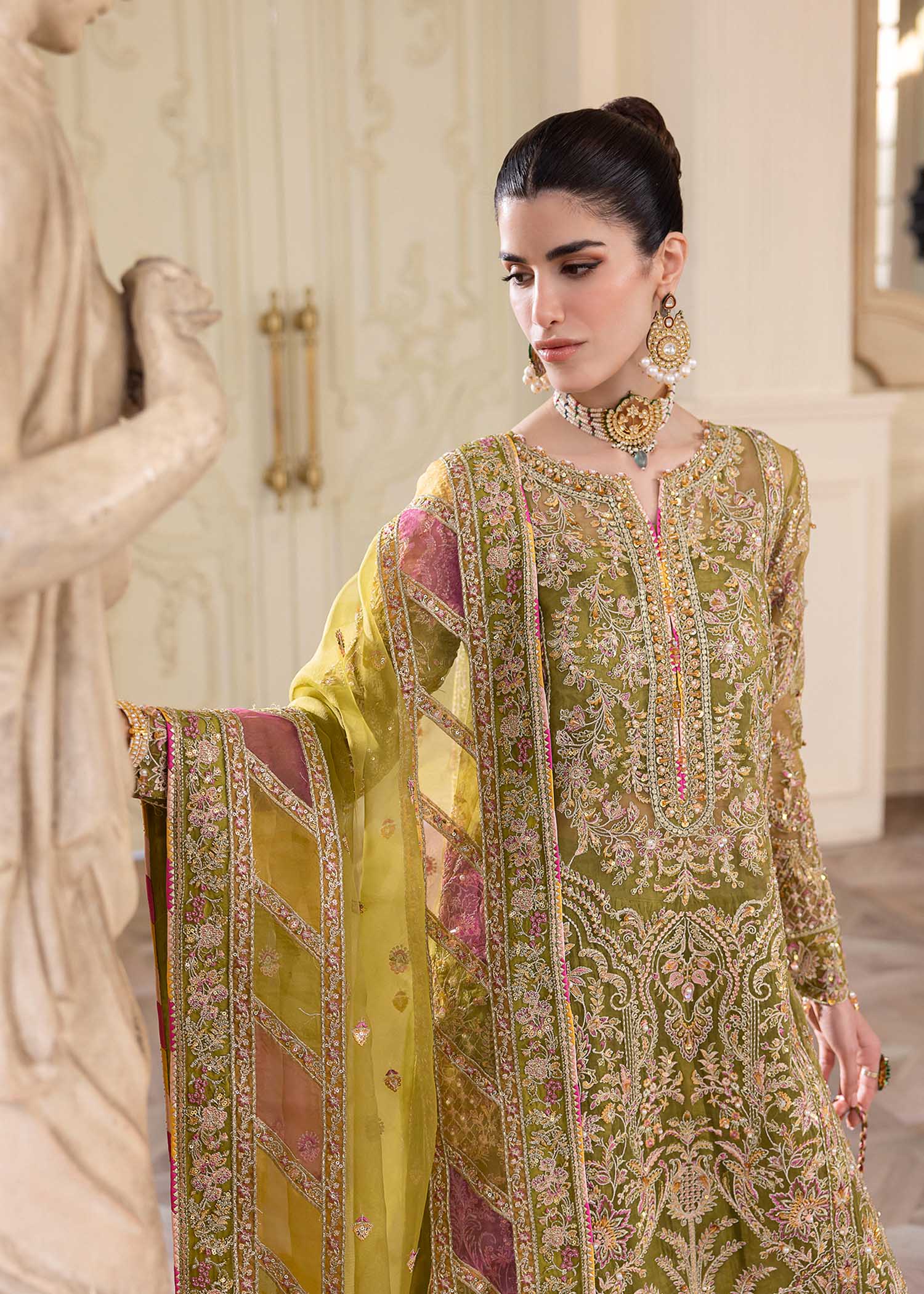 - 1 Olive Green Organza Shirt with Intricate Embroidery and Shimmering Embellishments