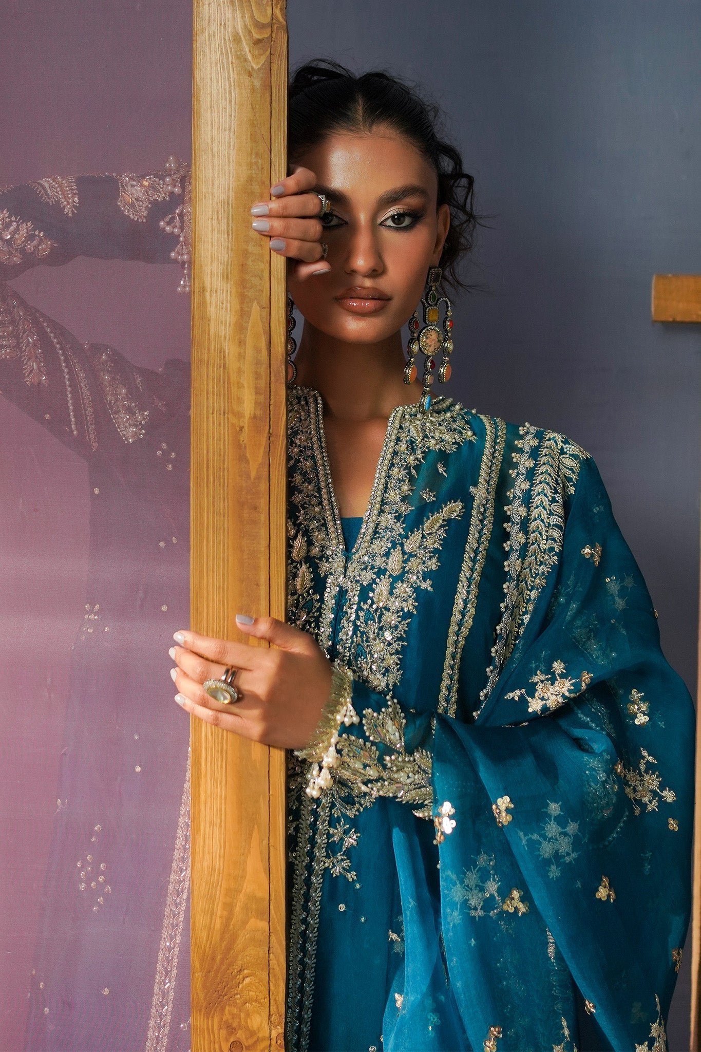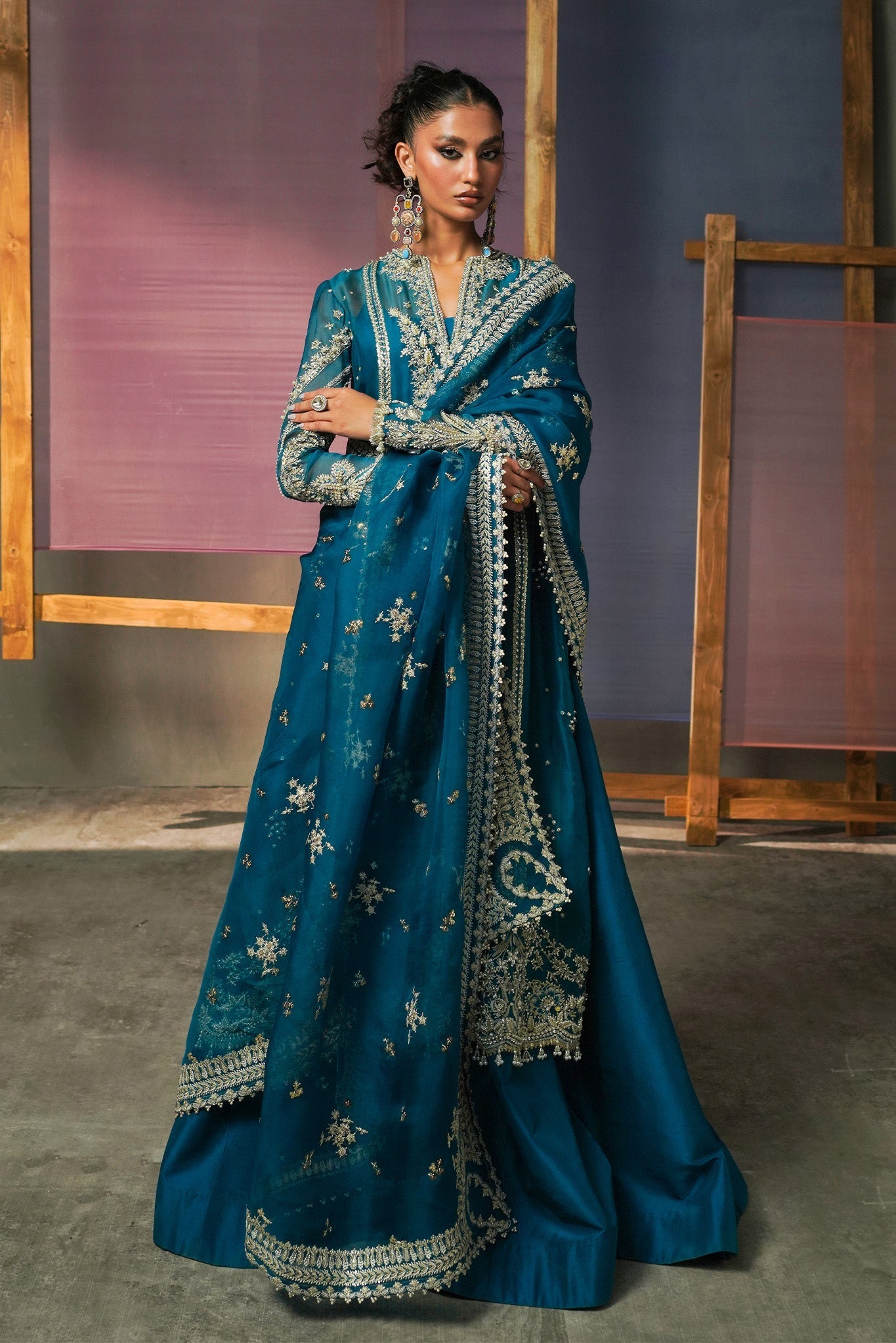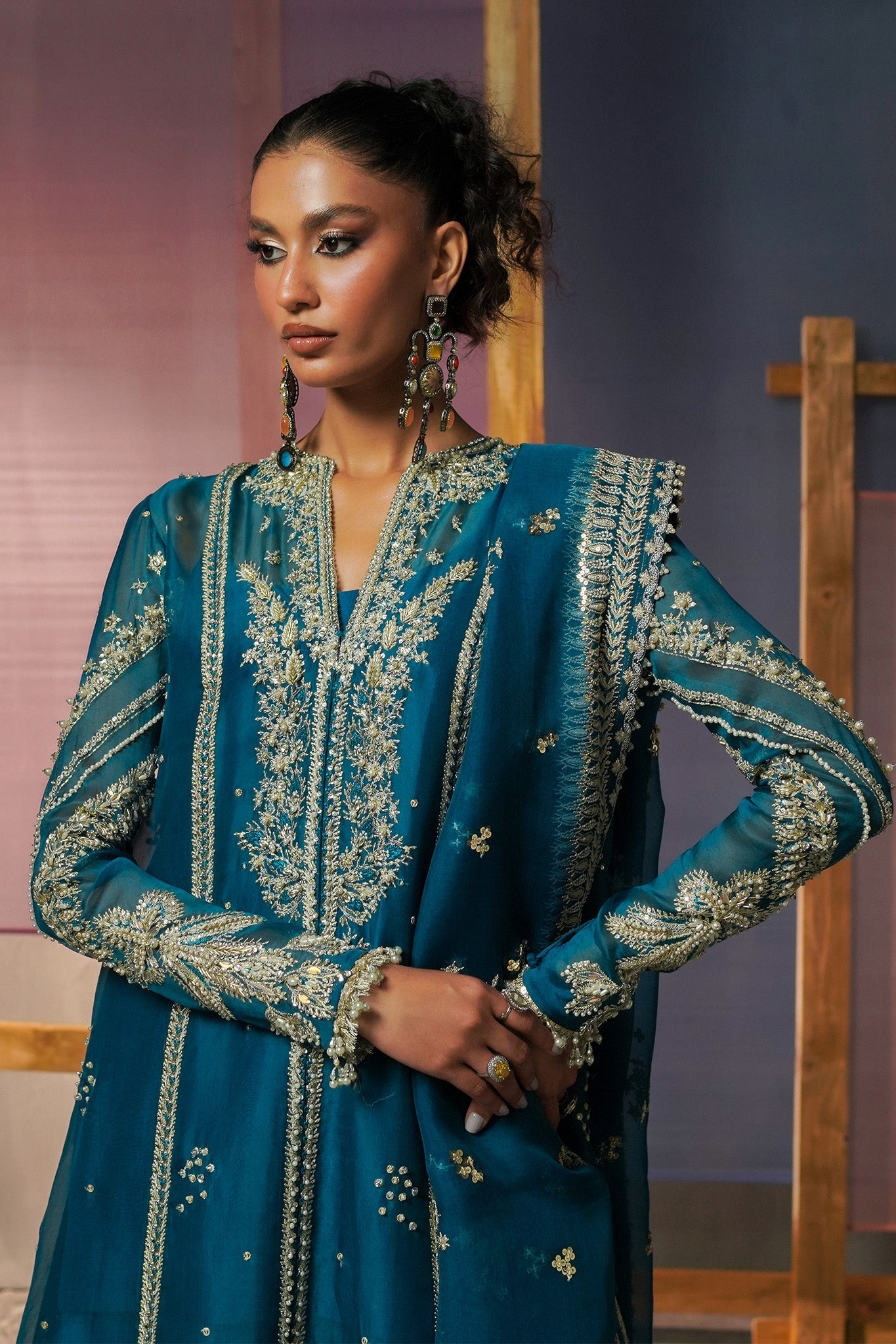 Presenting the teal blue dress with its stunning, elegant pearl and zardozi work truly exudes sophistication. The raw silk sharara adds a touch of luxury, and the delicate dupatta brings a graceful finish to the outfit. This outfit is a perfect fusion of traditional beauty and modern style.